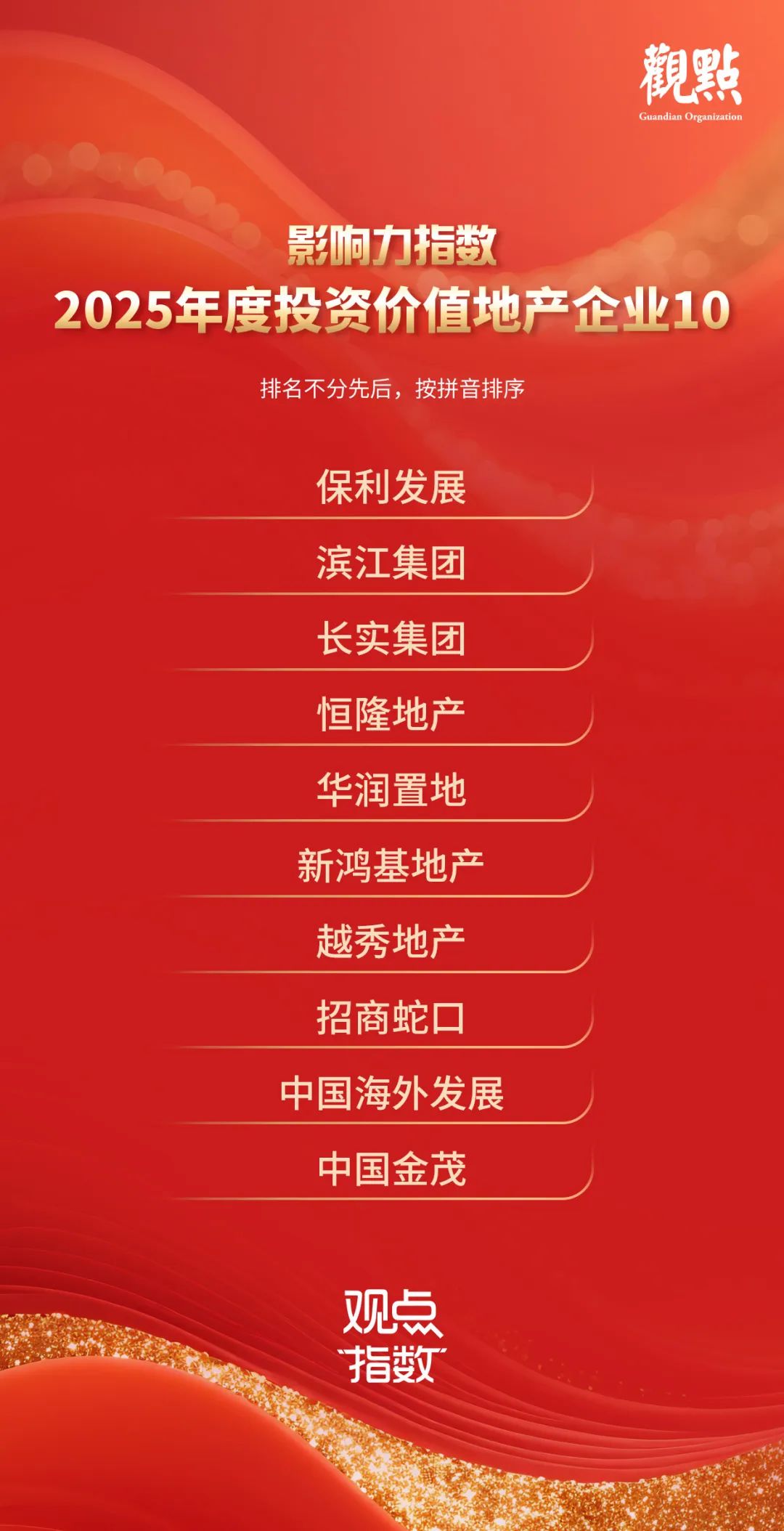 基于此,观点指数研究院对2025年度具备突出投资价值的地产企业进行全面评估,推动行业向高质量发展与价值投资理念深化转型。最终,长实集团、新鸿基地产、恒隆地产、、等10家企业凭借突出的表现,成功入选2025年度投资价值地产企业10,给行业发展带来借鉴意义。