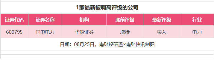 评级调高方面,8月25日,券商调高上市公司评级达到1家次,最新数据包括了华源证券对的评级从“增持”调高至“买入”。