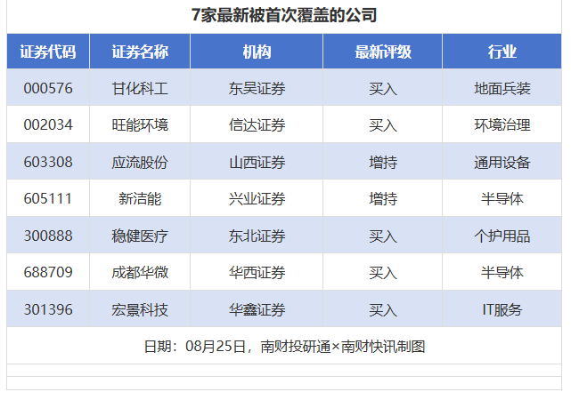 首次覆盖方面,8月25日券商共给出了7次首次覆盖,其中获得给予“买入”评级,获得给予“买入”评级,获得给予“增持”评级,获得给予“增持”评级,获得给予“买入”评级。