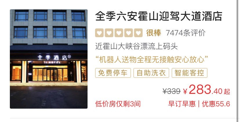 华住会显示,该酒店2022年开业,开店时间仅三年多,收到了7474条评价。介绍显示,该酒店靠近六安知名网红景区霍山大峡谷漂流上码头。入住价格在300元上下。