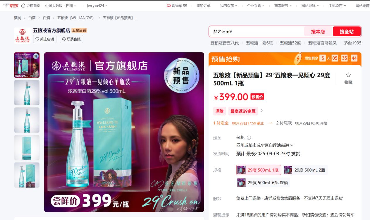记者从五粮液官方旗舰店和京东自营旗舰店了解到,该产品为五粮液推出的低度酒产品,酒精度29度,500ml产品预售价格为399元/瓶;100ml*3瓶礼盒装售价300元/盒。