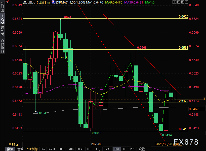 澳元兑美元的短期走势,将很大程度上取决于多方因素的博弈结果。市场对美联储降息的预期与对澳洲联储未来降息幅度的预期之间的较量,即将公布的澳大利亚7月CPI数据3以及美国的PCE通胀数据等,中美贸易关系的进展以及全球经济增长前景的变化等,都对澳元兑美元后续走势具备显著影响。技术分析日线图技术分析显示,澳元兑美元正尝试突破下降通道形态,暗示可能从看跌转向看涨趋势。