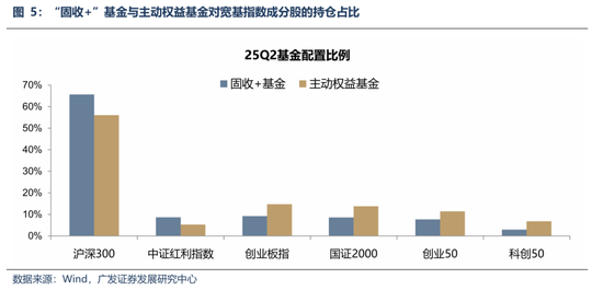 宽基来看,“固收+”基金偏好龙头白马为代表的沪深300及中证红利。相对于主动权益在沪深300、中证红利成分股的仓位更高,而创业板指、国证2000、创业50、科创50成分股的仓位都更低。其中有近66%的仓位在沪深300成分股。