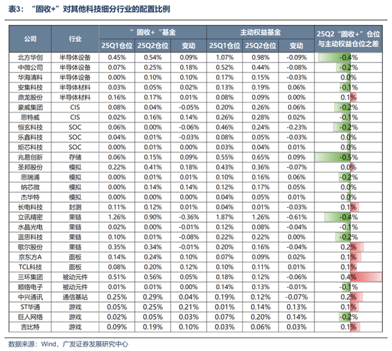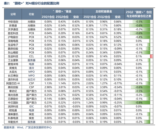 整体来看,无论是海外算力链条还是国内算力链条,“固收+”对几乎全产业链的配置仓位均不及主动权益,且Q2加仓力度也不及。
