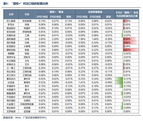 整体来看,对于出口链诸多行业,“固收+”的配置均较重、且仓位高于主动权益,如家居出口链、保温杯、轮胎、白电、工程机械、高机、叉车等。