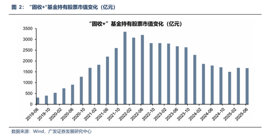 当前“固收+”基金持股规模仍不大。以偏债混合+二级债基+可转债基三类代表“固收+“基金,25Q2共1339只,持股市值共1670亿元,近几年持股市值持续下滑(份额也在赎回),21Q4持股市值高点为3353亿元。