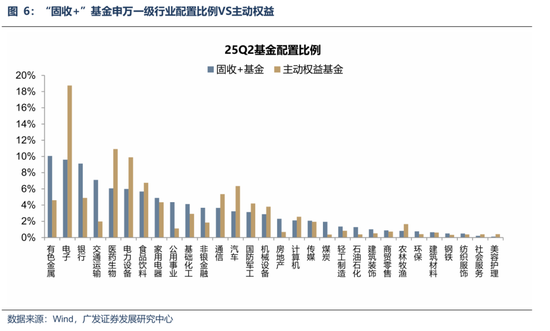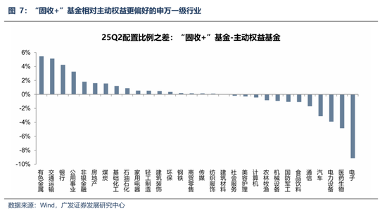 申万一级行业:“固收+”前五大重仓为有色、电子、银行、交运、医药。相对主动权益超配的前五大行业为有色、交运、银行、公用、非银。