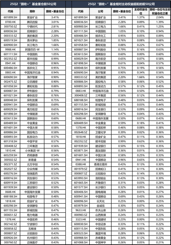 下方表格主要看三个要素:(1)“固收+”基金25Q2仓位,代表绝对配置强度。无论是主动权益还是“固收+”,前50大重仓的仓位门槛是0.4%,前100大是0.2%,前200大是0.1%左右;(2)25Q2“固收+”基金仓位与主动权益仓位之差,代表“固收+”的相对偏好;(3)“固收+”基金25Q2仓位变动与主动权益基金的比较,代表其Q2加仓幅度的强弱。