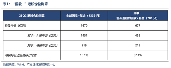 仓位向上空间比较大的是A股,港股仓位已经不低。1339只固收+基金中,有701只能买港股,数量占比、持股市值占比分别为52%、41%。测算得:能买港股的“固收+”基金25Q2的港股持仓占股票投资市值比重为32%。多数基金规定的上限为50%,仓位已经不低。