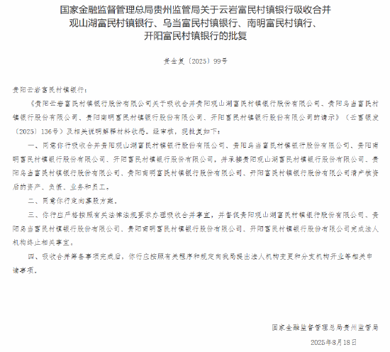 批复要求,贵阳云岩富民村镇银行应严格按照有关法律法规要求办理吸收合并事宜,并督促贵阳观山湖富民村镇银行股份有限公司、贵阳乌当富民村镇银行股份有限公司、贵阳南明富民村镇银行股份有限公司、开阳富民村镇银行股份有限公司完成法人机构终止相关事宜。