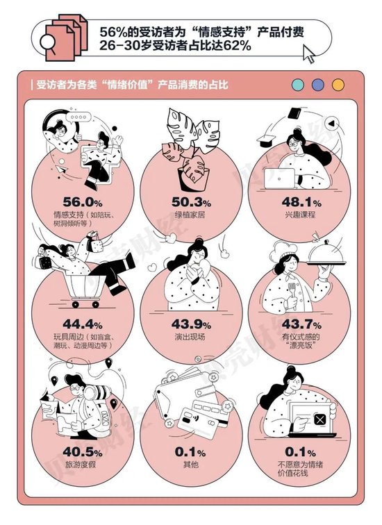 “五块钱的起送费我抠抠搜搜,几百块钱的谷子手办我说买就买!”“抠抠搜搜地花了很多钱,千金难买我乐意。”随着生活节奏的加快和社会压力的增大,年轻人对于情绪健康的重视程度持续提升,“情绪消费”应运而生并迅速崛起。从Labubu玩偶、现场演出,到手游氪金、植物疗愈,各类能够提供情绪价值、帮助年轻人进行高质量情绪调节的产品和服务,正如雨后春笋般走红。《报告》指出,56%的受访者愿意为 “情感支持类” 产品付费,其中18-25岁人群尤其热衷于绿植家居、兴趣课程等“自我投射型消费”。