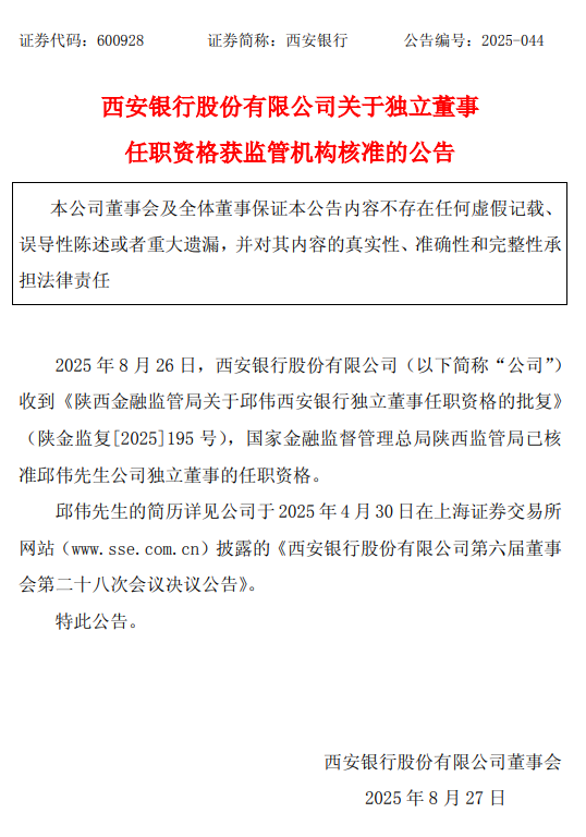 8月26日金融一线消息,公告称,公司收到《陕西金融监管局关于邱伟西安银行独立董事任职资格的批复》(陕金监复[2025]195 号),国家金融监督管理总局陕西监管局已核准邱伟公司独立董事的任职资格。
