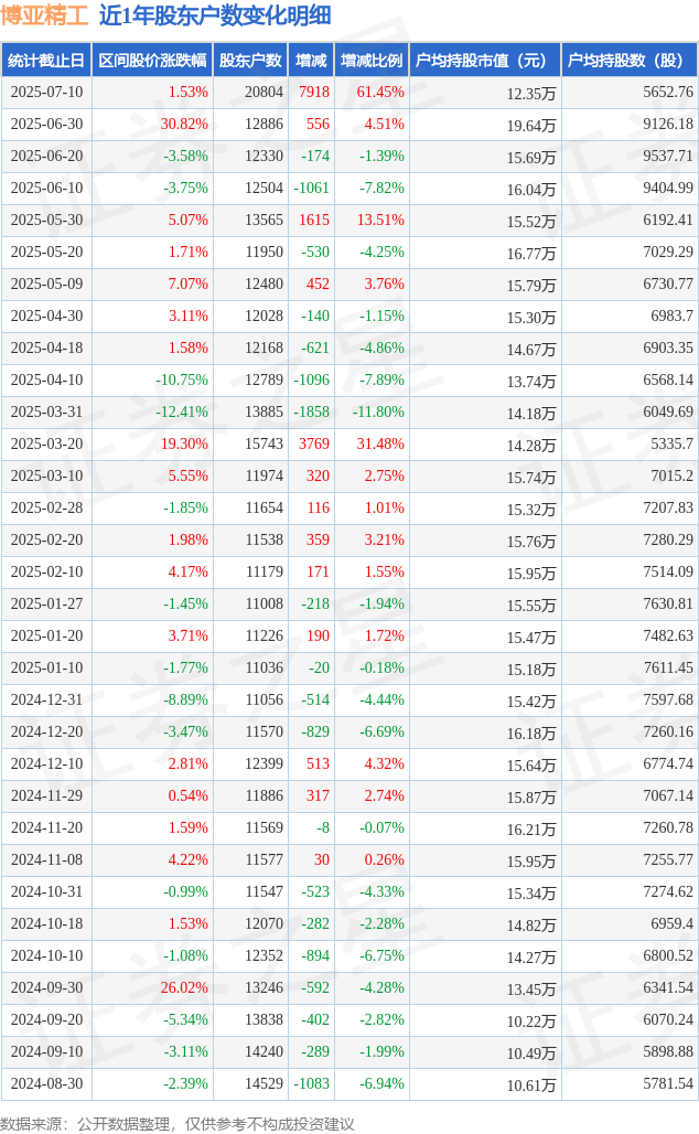从股价来看,2025年6月30日至2025年7月10日,博亚精工区间涨幅为1.53%,在此期间股东户数增加7918.0户,增幅为61.45%。