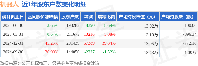 从股价来看,2025年3月31日至2025年6月30日,机器人区间跌幅为3.65%,在此期间股东户数减少1.84万户,减幅为8.69%。