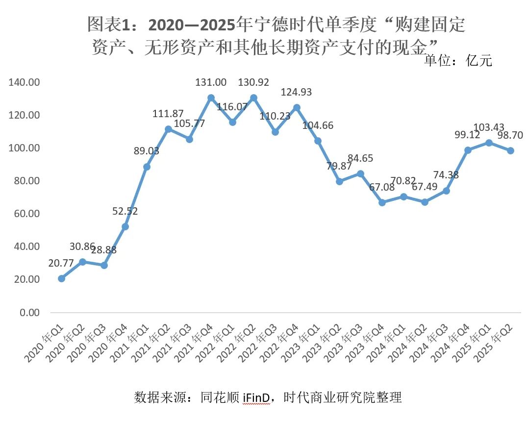 以宁德时代为例,在经历一年多的下滑后,2024年第三季度,宁德时代“购建固定资产、无形资产和其他长期资产支付的现金”开始回升;2024年第四季度更是达到99.12亿元,环比增长33.3%,同比增长47.8%。