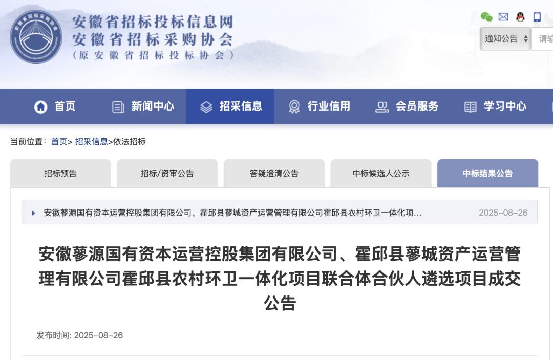 近日,中国固废网从E20环境平台标讯采集系统E标通获悉,8月26日,霍邱县农村环卫一体化项目联合体合伙人遴选项目发布成交结果公告,、、、四大知名环卫企业入选。