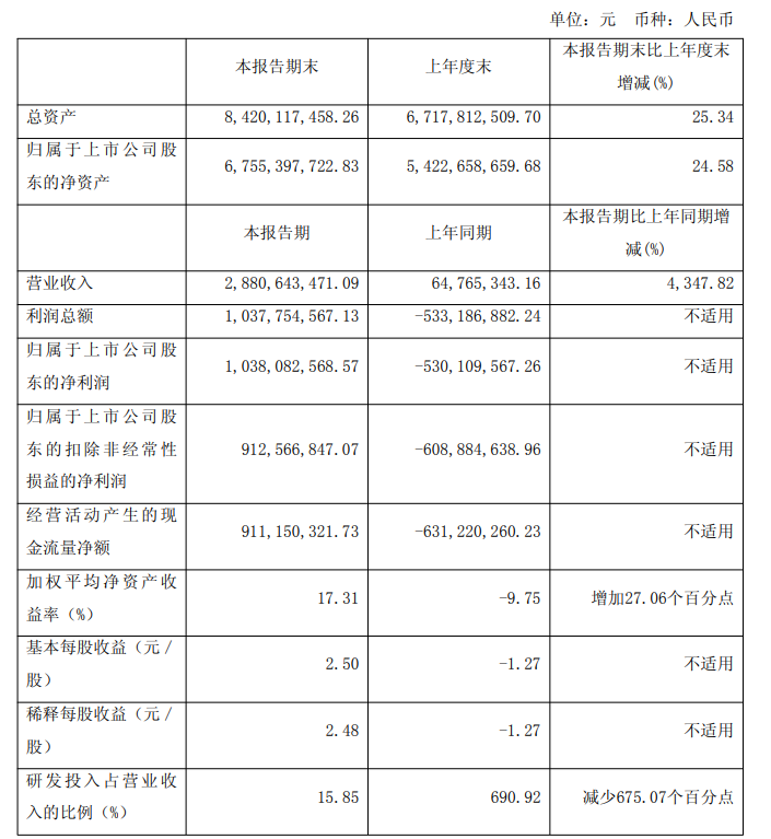 - 营业收入28.81亿元,同比增长4347.82%,实现历史性突破