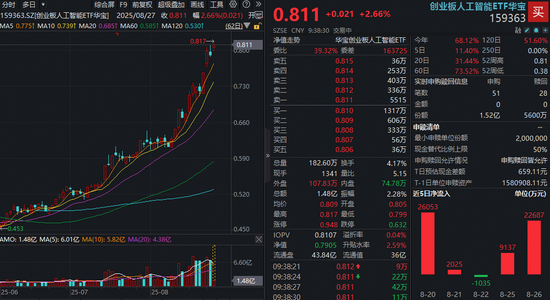 热门ETF方面,同标的指数规模更大、流动性突出的创业板人工智能ETF(159363)场内快速涨超3%续创上市新高,实时成交额超1.4亿元,资金实时净申购9600万份!
