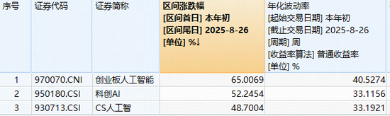 注:统计区间为2025.1.1-2025.8.26,基日为2018.12.28,发布日期为2024.7.11。创业板人工智能指数2020-2024年年度涨跌幅分别为:20.1%、17.57%、-34.52%、47.83%、38.44%,指数成份股构成根据该指数编制规则适时调整,其回测历史业绩不预示指数未来表现。