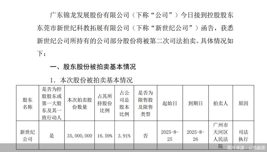 根据 *** 司法拍卖网站,锦龙股份控股股东——东莞市新世纪科教拓展有限公司(以下简称“新世纪公司”)所持有的锦龙股份3500万股在8月25日10:00启动第二轮司法拍卖,拍卖周期为1天。