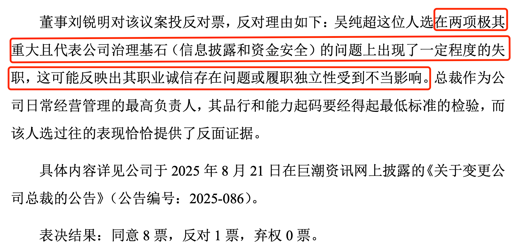值得注意的是,虽然最终当选,但是在金力泰审议聘请公司新任总裁的董事会中,针对吴纯超,金力泰的董事刘锐明投了唯一的反对票,其反对理由为“吴纯超这位人选在两项极其重大且代表公司治理基石(信息披露和资金安全)的问题上出现了一定程度的失职,这可能反映出其职业诚信存在问题或履职独立性受到不当影响。