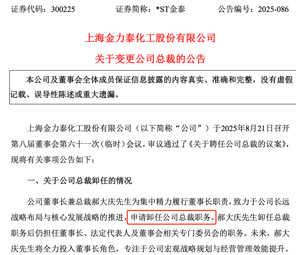 也正是在这个公告中,金力泰表示董事会同意由郝大庆担任公司董事长、总裁。