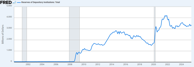 当然,这并不意味着美联储没有持有大量资产。它依然持有,只是不再是RRP。目前,美联储依然持有3.3万亿美元准备金,低于2022年的峰值4.2万亿美元。
