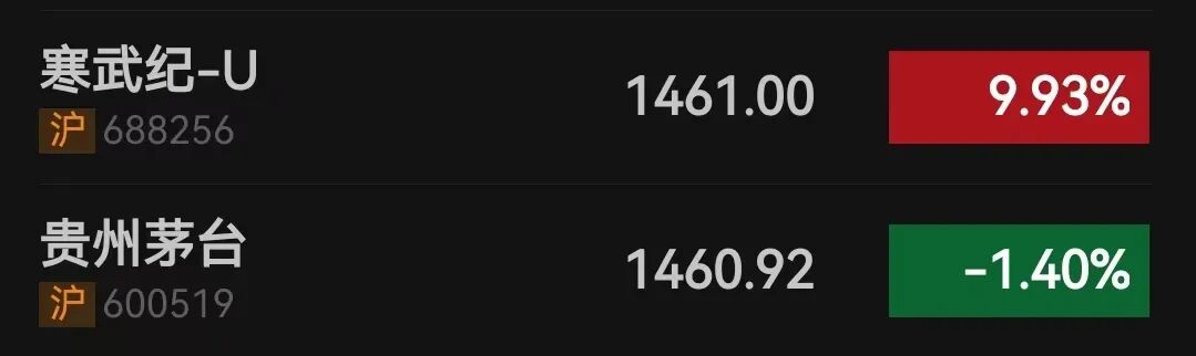 值得一提的是,盘中寒武纪股价一度超越茅台。