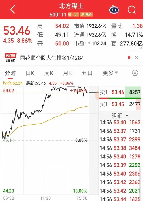 今日,稀土永磁概念股表现活跃。北矿科技涨停,北方稀土涨超8%,盘中一度涨停,位居同花顺热股榜之一,成交额同样居A股之一位。