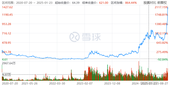 截至8月27日收盘,寒武纪年内涨幅已翻倍,尤其是在7月25日至8月26日期间,累计涨幅高达121.42%。自2022年低点算起,三年间涨幅高达28倍。寒武纪一跃成为千元芯片股,市值突破6000亿元,被赋予“国产替代破局者”的角色。
