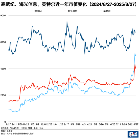 截至8月27日时,寒武纪收盘价1372.10元,总市值5794亿元。当日美国老牌芯片巨头英特尔市值1077亿美元(约合7701亿元)。按照这个数据计算,寒武纪市值约等于英特尔的75%。2025年以来(1月1日-8月27日),寒武纪市值已上涨116%。近一个月(7月28日-8月27日),寒武纪市值上涨102%。