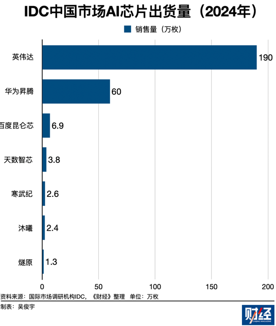 国际市场调研机构IDC公布的2024年中国市场AI芯片出货量显示,英伟达出货量超过190万片,占比70%;华为昇腾出货量超过60万枚,占比约23%;百度昆仑芯6.9万枚、天数智芯3.8万枚、寒武纪2.6万片、沐曦2.4万枚、燧原1.3万枚,其他厂商的出货量均未过万。