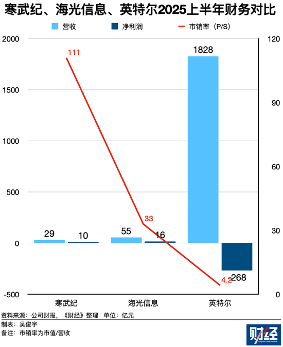 市销率(P/S,即市值/营收)是评估成长型企业市值合理性的一个重要指标。市销率越低,一般说明企业可能越被低估。截至2025年二季度,寒武纪、海光信息、英特尔的市销率分别是111倍、33倍、4.2倍。