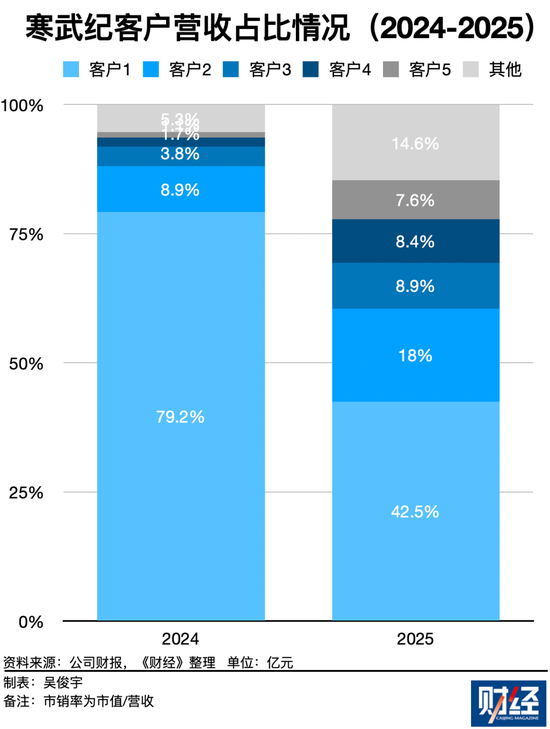 寒武纪的主要客户包括中国大型科技公司、电信运营商、 *** 部门等。它的客户集中度较高,2025年客户集中度高的问题有所改善。这表现在,寒武纪2024年更大客户占其营收近八成,但2025年更大客户占其营收仅有四成。