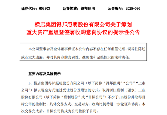 8月27日晚间得邦照明公告,公司拟以现金方式通过受让股份及增资的方式,取得浙江嘉利(丽水)工业股份有限公司(简称“嘉利股份”)不少于51%股份并取得其控制权。具体交易方式、交易对方、收购比例待进一步论证和协商。根据初步测算,本次交易预计构成重大资产重组。