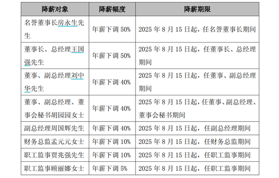 其中,名誉董事长房永生、董事长兼总经理王国强等8人年薪将下调,下调幅度在5%至50%不等,自2025年8月15日起生效。