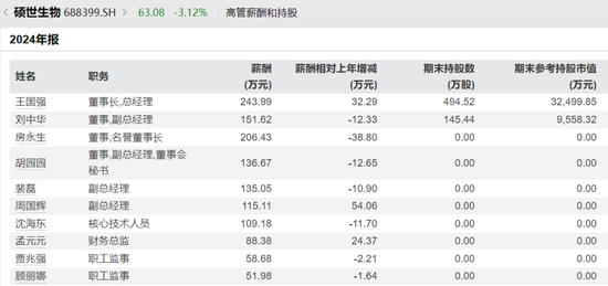公开资料显示,2024年,硕世生物共有七位高管的年薪超百万元。其中,房永生的年薪为206.43万元,王国强的年薪为243.99万元,董事、副总经理刘中华的年薪为151.62万元。