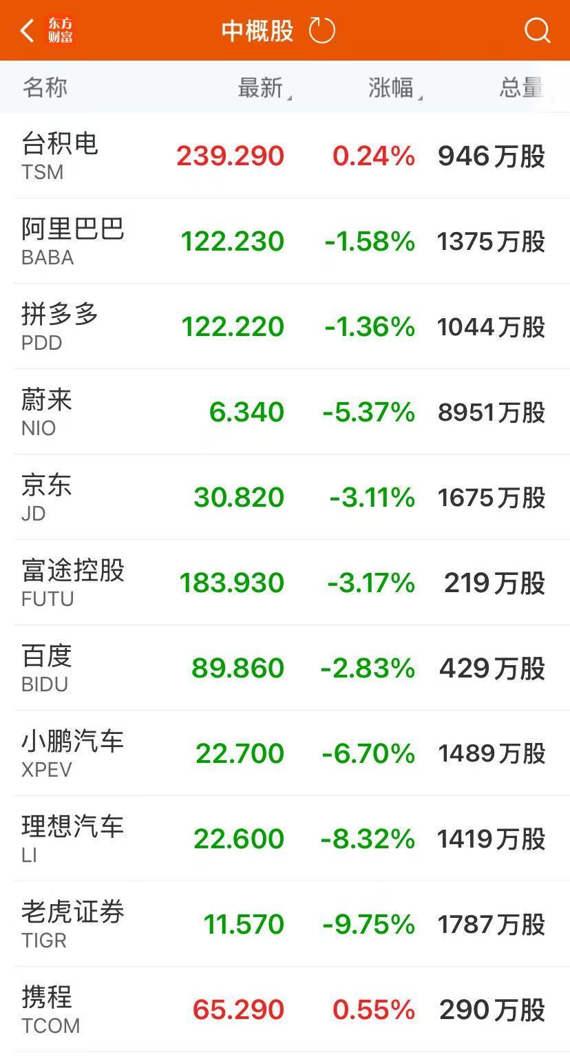 热门中概股普跌,纳斯达克中国金龙指数跌2.58%,阿里巴巴跌1.58%,京东跌3.11%,拼多多跌1.36%,蔚来跌5.37%,小鹏汽车跌6.70%,理想汽车跌8.32%,哔哩哔哩跌1.28%,百度跌2.83%,网易跌1.44%,腾讯音乐跌1.56%,小马智行跌1.96%。