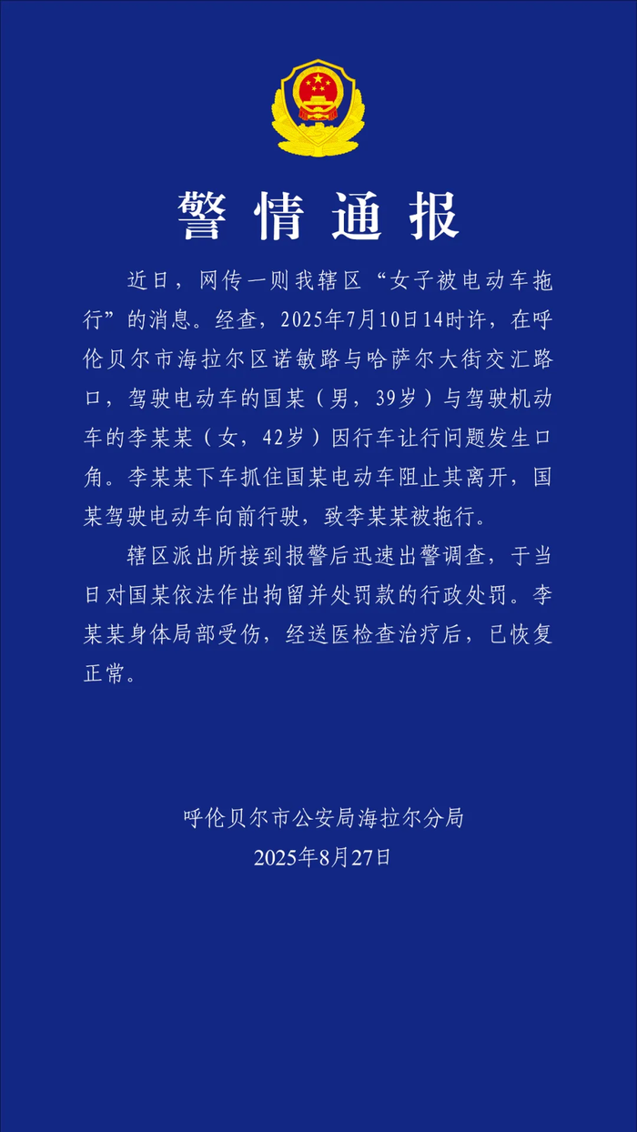 呼伦贝尔市公安局海拉尔分局8月27日通报,近日,网传一则该辖区“女子被电动车拖行”的消息。经查,2025年7月10日14时许,在呼伦贝尔市海拉尔区诺敏路与哈萨尔大街交汇路口,驾驶电动车的国某(男,39岁)与驾驶机动车的李某某(女,42岁)因行车让行问题发生口角。李某某下车抓住国某电动车阻止其离开,国某驾驶电动车向前行驶,致李某某被拖行。辖区派出所接到报警后迅速出警调查,于当日对国某依法作出拘留并处罚款的行政处罚。李某某身体局部受伤,经送医检查治疗后,已恢复正常。