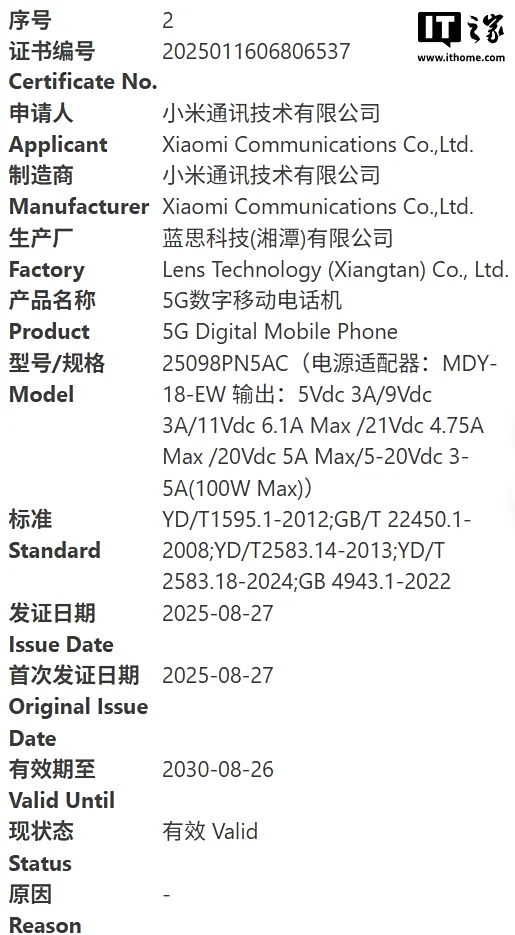 IT之家查询中国质量认证中心官网后发现,其中 25098PN5AC、2511 *** N0EC 已在网站公布,其中前者由 (湘潭) 有限公司生产,后者由小米通讯技术有限公司生产,两台手机均配备 MDY-18-EW 充电头,IT之家附上输出规格如下: