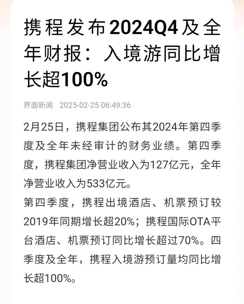 业绩报告披露的数据显示,报告期内国际OTA平台总预订同比增长超过60%;入境旅游预订同比增长超过100%;出境酒店和机票预订已全面超越2019年疫情前同期的120%水平,全国跨境航班运力恢复至疫情前的84%水平。