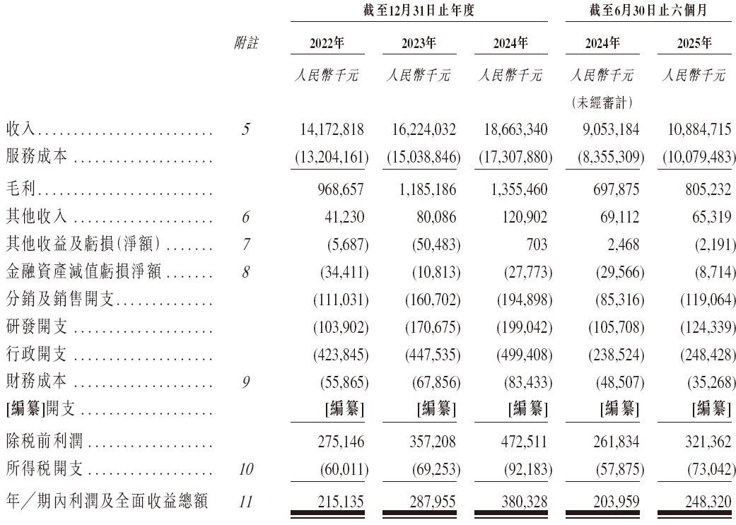招股书显示,在过去的2022年、2023年、2024年和2025年前六个月,安得智联的营业收入分别为人民币141.73亿、162.24亿、186.63亿和108.85亿元,相应的净利润分别为人民币2.15亿、2.88亿、3.80亿和2.48亿元。