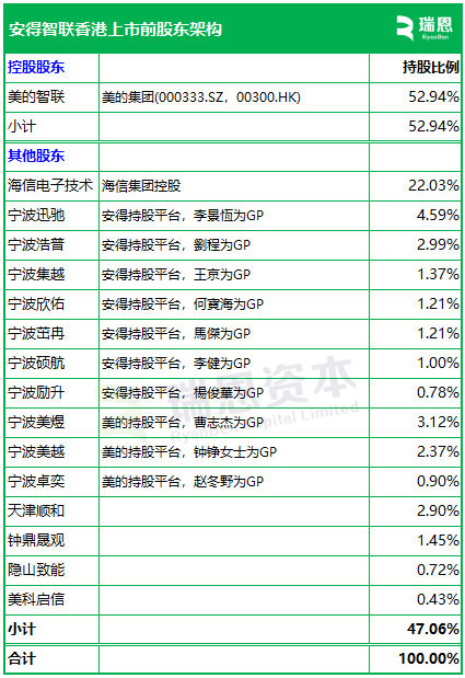 美的集团(000333.SZ,00300.HK)全资子公司美的智联,持股52.94%,为控股股东;