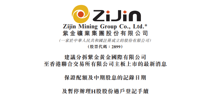 紫金矿业宣布,在分拆紫金黄金国际方面,拟在后者进行全球发售时,以优先发售的方式向其合资格H股股东,提供约5%的初步提呈发售的紫金黄金国际股份,作为保证配额。