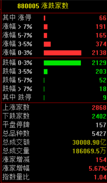 全市场共2868只个股上涨,66只个股涨停,2402只个股下跌。