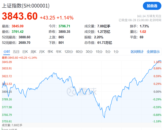 8月28日,A股三大指数集体大涨,盘中虽然大幅跳水,但有惊无险,下午一点半左右,上演大逆转,持续拉升!截至收盘,沪指涨1.14%,深成指涨2.25%,创业板指涨3.82%。