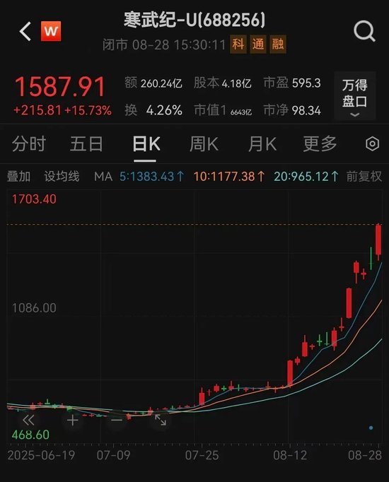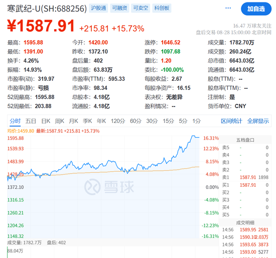 股价超越,登顶A股新股王。股价逼近1600元,涨超15%,总市值突破6600亿元。股民戏称:“英伟达是谁啊?一点都不熟,我只认识寒武纪。”