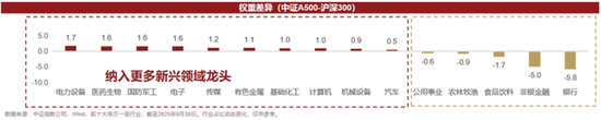 其次,相较于沪深300,更加关注新兴行业。中证A500指数堪称“新质生产力集中营”,纳入了更多电力设备、医药生物、通信、计算机等新兴行业龙头公司。新兴行业含量高,也就意味着在成长风格来临时,可以具有更高的弹性。
