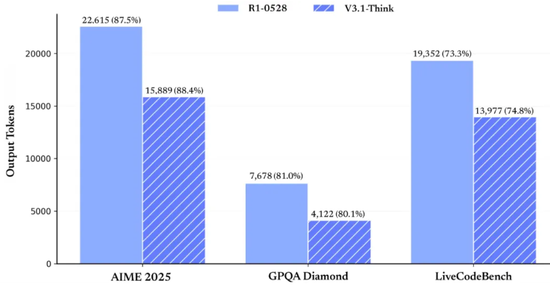 注:在各项评测指标得分基本持平的情况下(AIME 2025: 87.5/88.4, GPQA: 81/80.1,liveCodeBench: 73.3/74.8),R1-0528与V3.1-Think的token消耗量对比图;资料参考:深度求索《DeepSeek-V3.1发布,迈向Agent时代的之一步》,2025.8.21