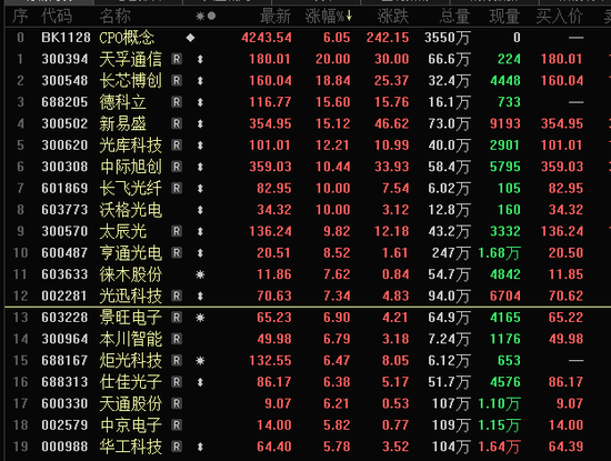 CPO概念大涨超6%,实现20%涨停,涨近20%,、、等多股上涨超10%,、等涨停。
